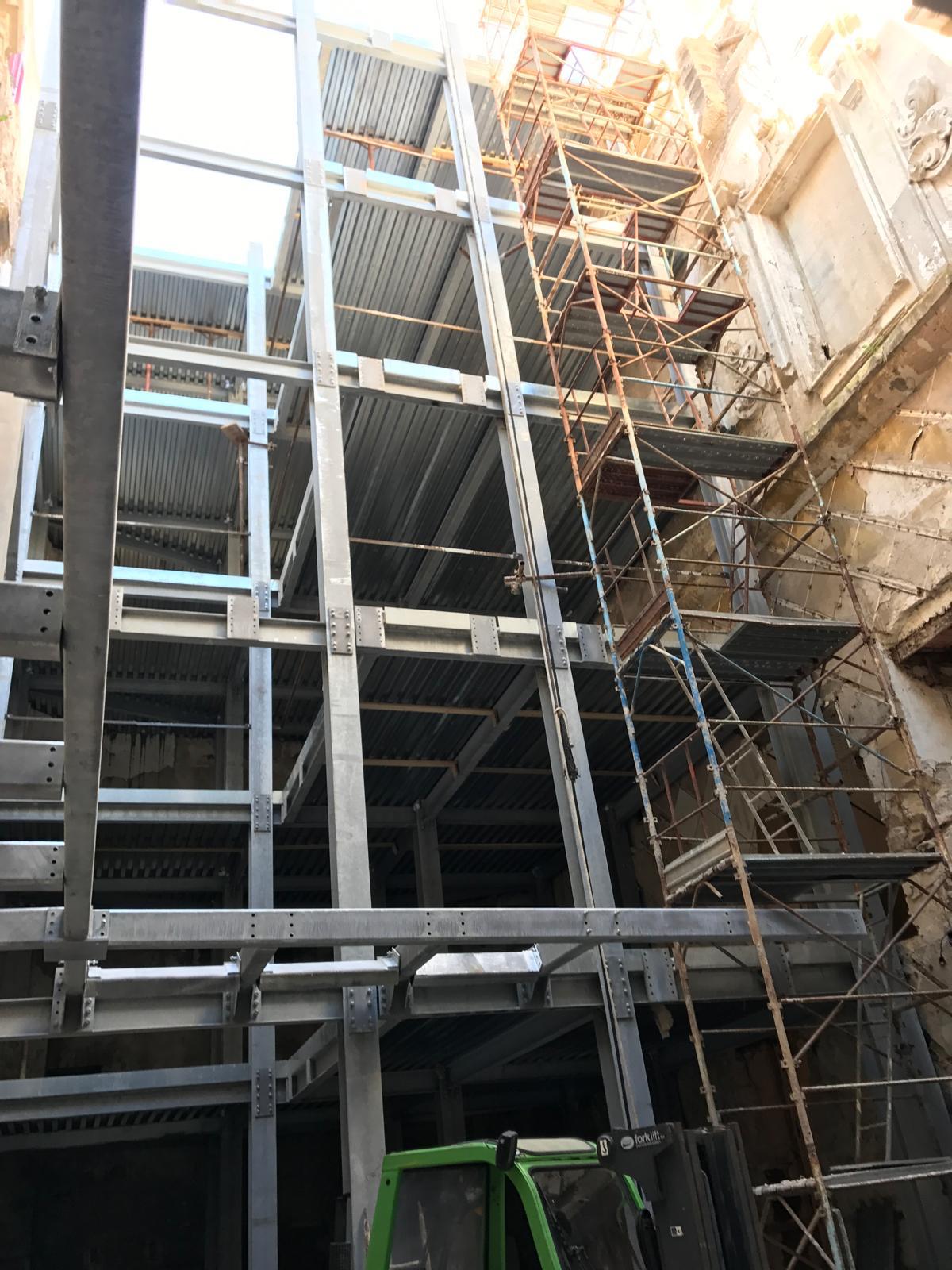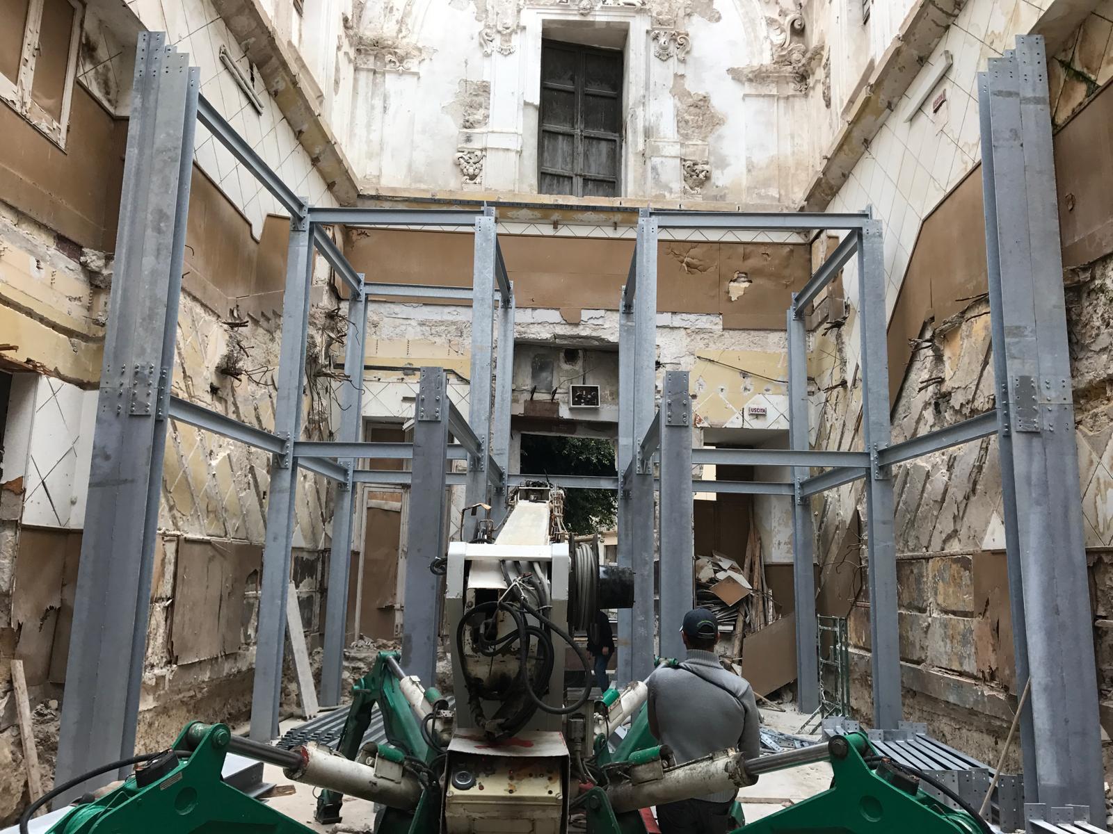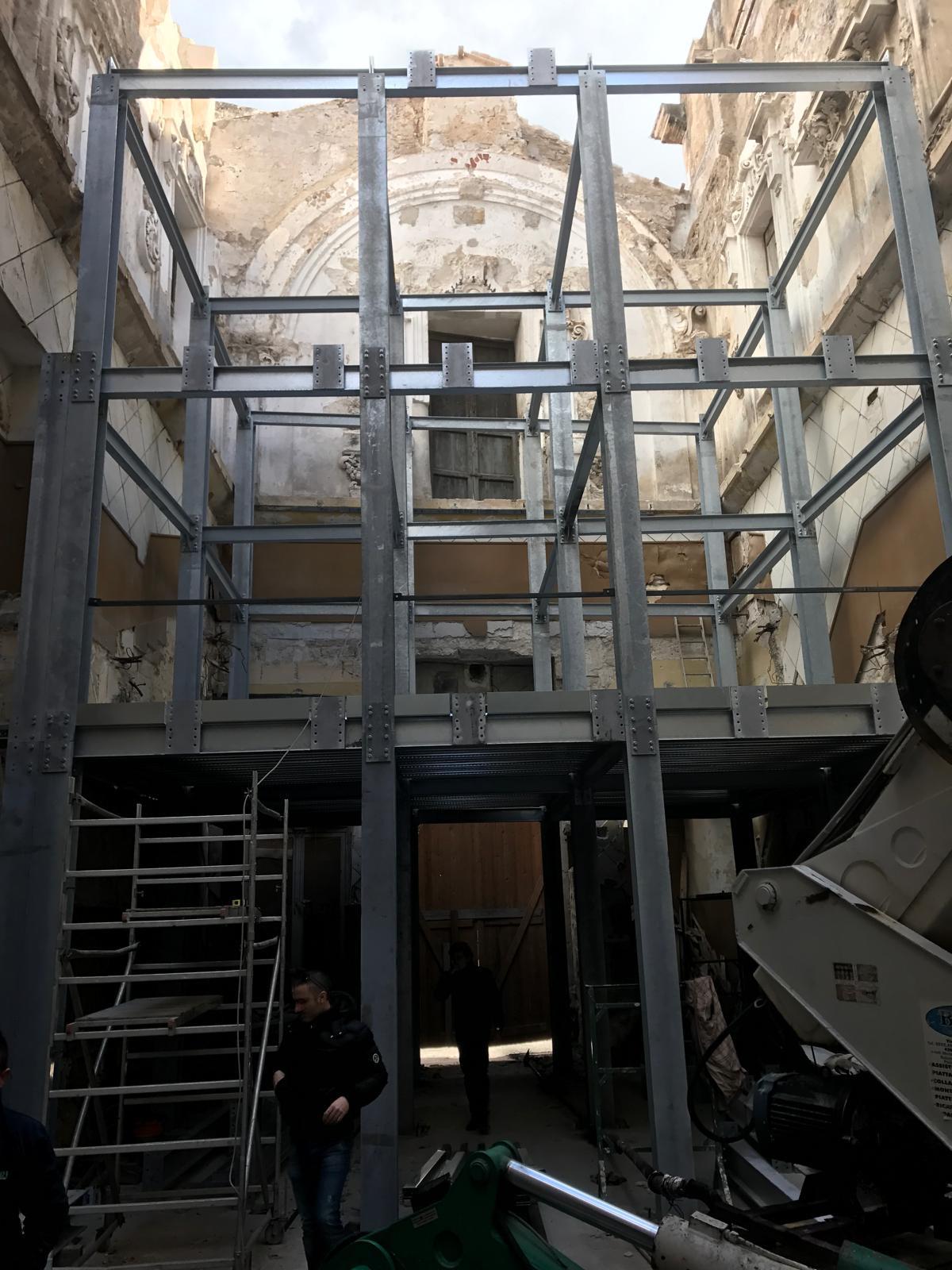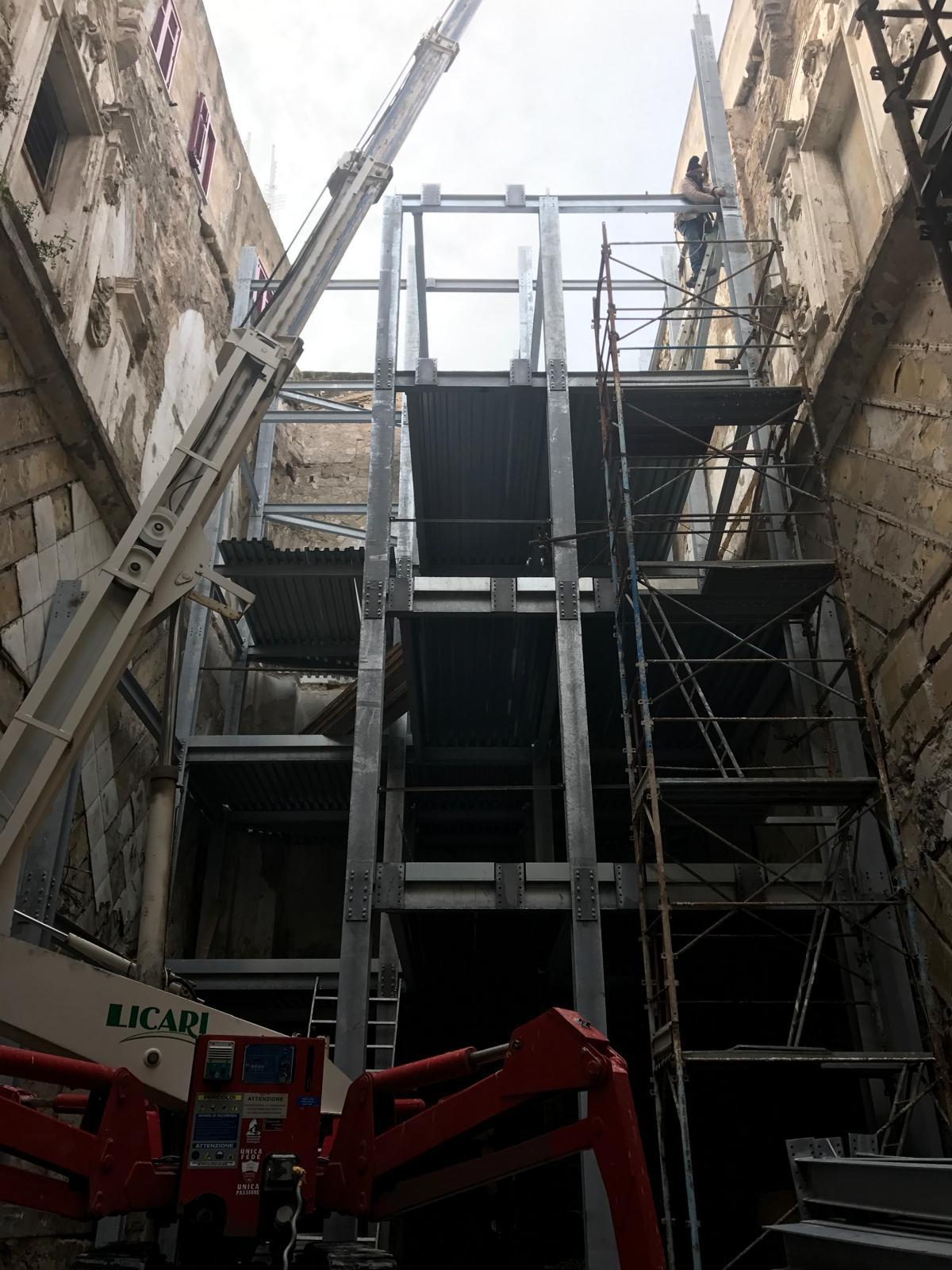 Fornitura e posa in opera di struttura multipiano con annesse passerella, scala interna e struttura ascensore, realizzata nel centro storico di Trapani, e da inserire all’interno di un edificio che ospiterà negozi ed appartamenti.