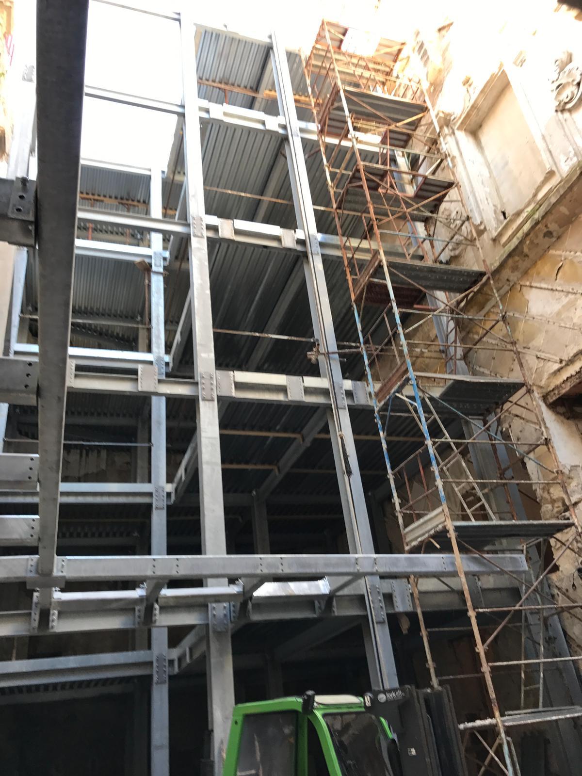 Fornitura e posa in opera di struttura multipiano con annesse passerella, scala interna e struttura ascensore, realizzata nel centro storico di Trapani, e da inserire all'interno di un edificio che ospiterà negozi ed appartamenti.