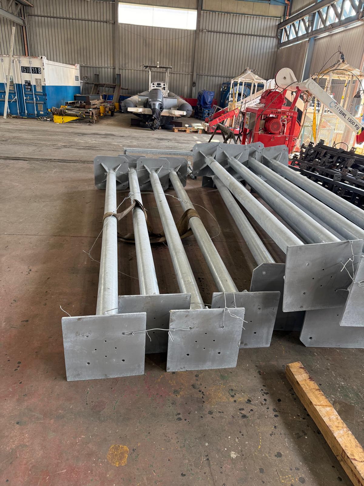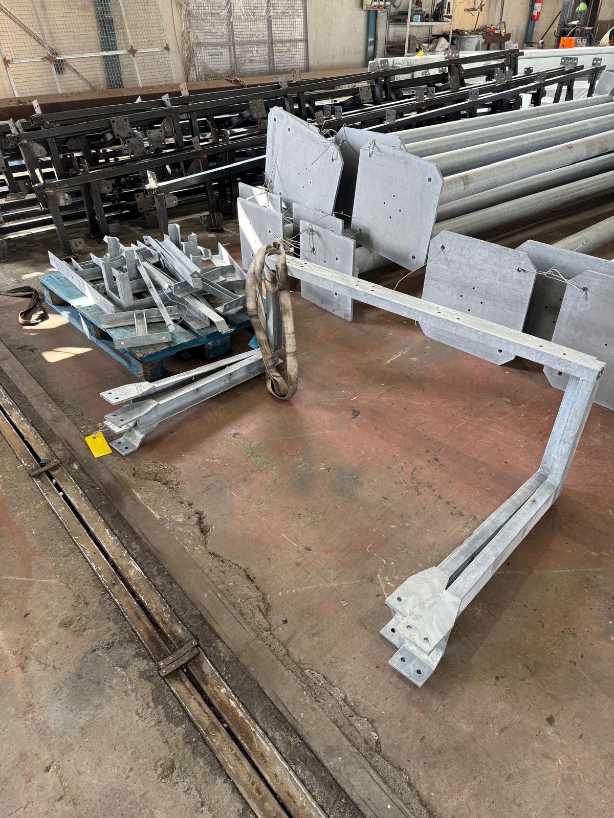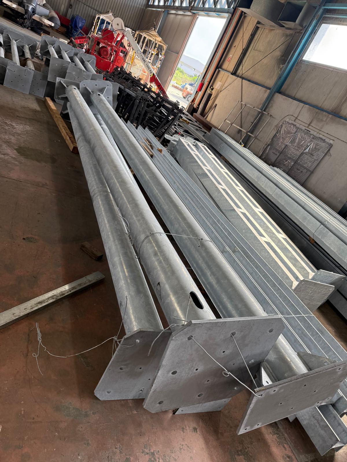 Costruzione impianti substazioni elettriche, costituite in alcuni casi da colonne in tubo di varia sezione, in altri da colonne tralicciate in Upn 180 forati, con piastre e rinforzi assemblati e saldati sia in testa che al piede e sormontate in alcuni casi da tralicci in UPN 140 e lamiere di diverso spessore, a cui verranno poi assemblati e saldati in cantiere degli angolari forati.
